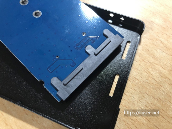 SSD를 체결하고 나면 케이스는 별도의 나사없이 보드를 알루미늄 케이스에 고정시킬 수 있다. 플라스틱 돌출부가 케이스의 홈에 끼워지면 움직이지 않는 그런 방식이다.