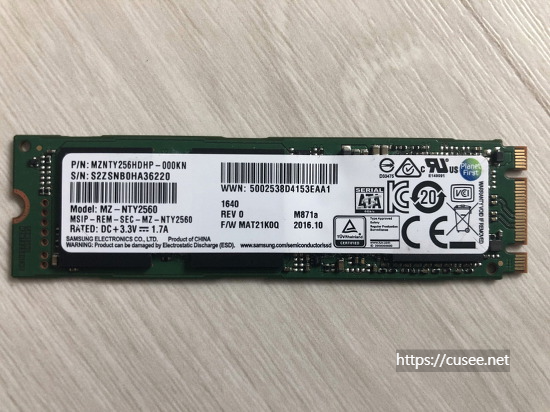 256GB SSD 모델은 삼성전자에서 만든 MZ-NTY2560이다. 위 사진에 보듯이 슬롯 타입은 노치가 양쪽으로 나있는 B&M Key타입(m.SATA)이다. 최근에 나오는 고용량 제품들은 오른쪽 노치의 M타입(NVME)이 많다.