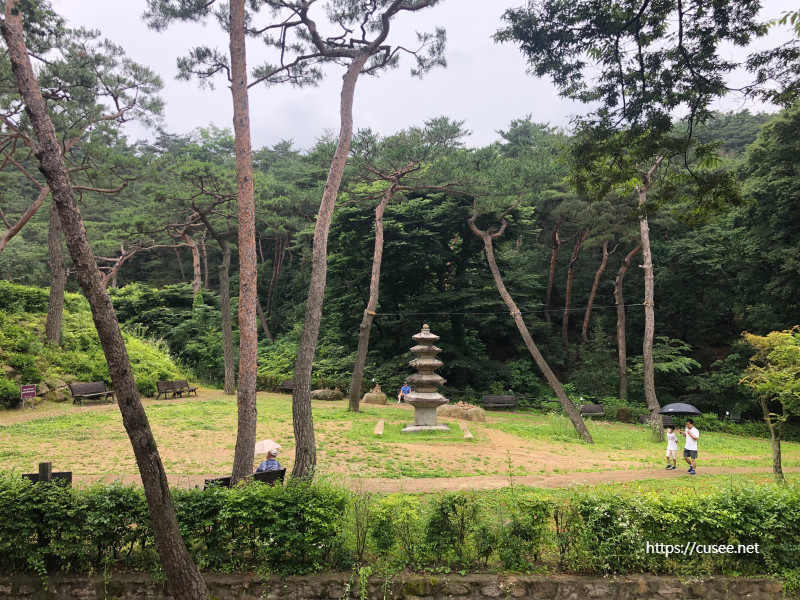 대웅전 향하는 길 오른쪽으로는 작은 개울 너머 오층석탑도 보인다. 1908년에 쌓은 것이라 한다. 다른 사찰과 달리 공원처럼 꾸민 것은 좀 색다르다. 워낙 많은 등산객들이 오르내리는 길목에 있어서인지 벤치와 같은 편의시설은 곳곳에 보인다. 어쩌면 이런 친근함이 불교가 중생에게 다가가는 현대판 참모습일 수 있겠다.