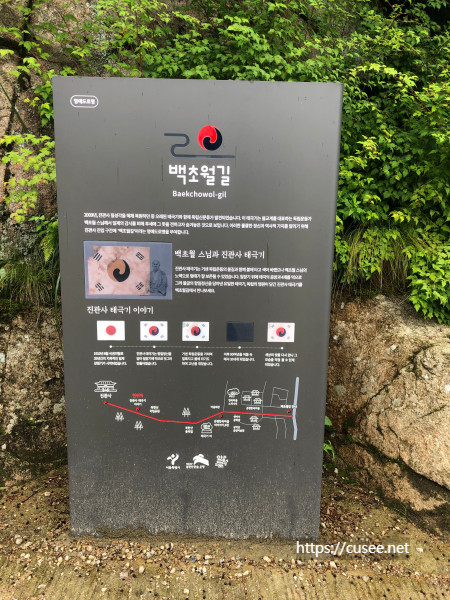 일장기 위에 먹을 칠해 태극기를 그려 놓은 것으로 진관사 태극기라 부른다. 이를 기념하기 위해 한옥마을 입구에서 진관사에 이르는 길을 '백초월길'이라 명명해 놨다.