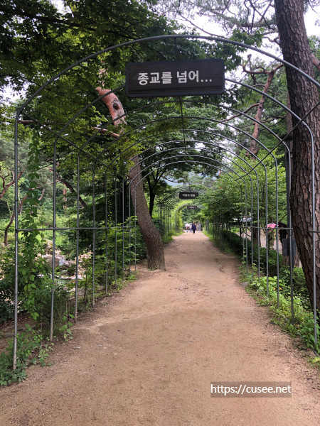 '종교를 넘어...', '마음의 정원'과 같은 표지말을 보면서 극락교로 이어진다. 찻길과 구분되는 인도인데, 도심 속 사찰이라 어쩔 수 없는 모양이다. 저런 표찰과 파이프(물론 연등이나 덩굴 등을 위해 만들었겠지만)는 사찰 풍광과는 어울리지 않는다. 있는 그대로가 사찰 주변 자연의 본모습이다.