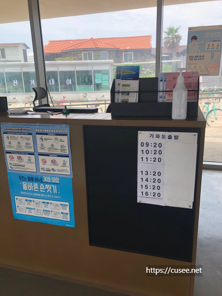 대합실 입구에는 매표소가 있다. 가파도 출발시간이 적혀 있는데, 마지막은 16:20분이다. 모두 20분 출항인데, 운진항에서 정각에 출발, 10여분 만에 와서 다시 20분에 떠나는 거였다. 제주 운진항으로 돌아가는 분홍색 승선 티켓을 구입하는 곳이다. 왕복 티켓을 끊은 손님이라면 상관없지만, 섬주민이거나 숙박 후 돌아가는 사람에게 필요한 터미널 대합실 예매창구다.