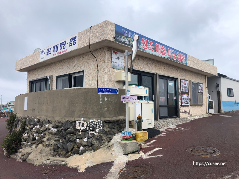 짬뽕을 먹은 곳이다. 가파포구(하동) 바로 앞 언덕에 위치해 있고, 해물짜장과 해물짬뽕이 유명하다. 우린 해물짬뽕을 먹었는데, 가격은 한 그릇 12,000원. 소라와 게, 해초들이 들어가 있다. 맛은 자극적이지 않고 국물은 시원하다. 약간의 비린 맛은 나는데 어쩔 수 없다. 이곳 말고도 해물짬뽕 가게가 몇 개 있는데, 제주사람으로부터 이 집에 가라는 추천을 받고 방문했다. 엄청 맛난 짬뽕을 기대하면 실망할 듯!