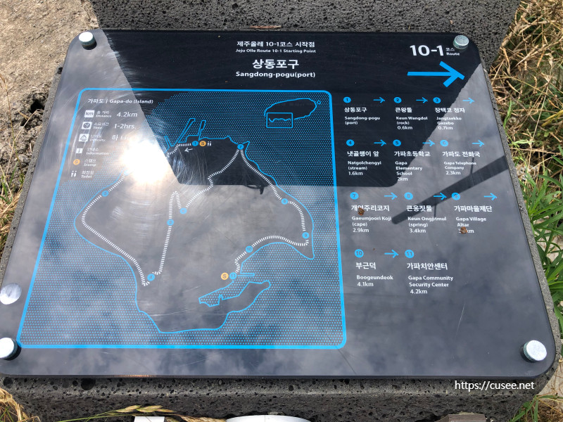 섬은 아래 위로 두 개의 동네가 있는데, 각각 상동과 하동, 위, 아래 동네로 구분된다는 이야기. 섬 전체를 둘러보는 올레길은 도보로 약 1시간 거리(4.2Km)다. 마음 급한 사람은 그냥 상동포구에서 가파포구(하동)으로 가는 지름길을 이용하면 25분이면 도착하는 짧은 거리다. 그래도 마라도 보다는 크다.