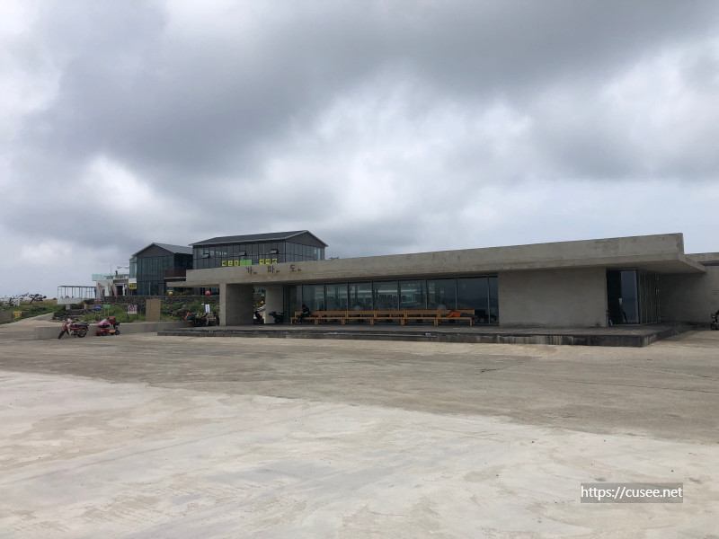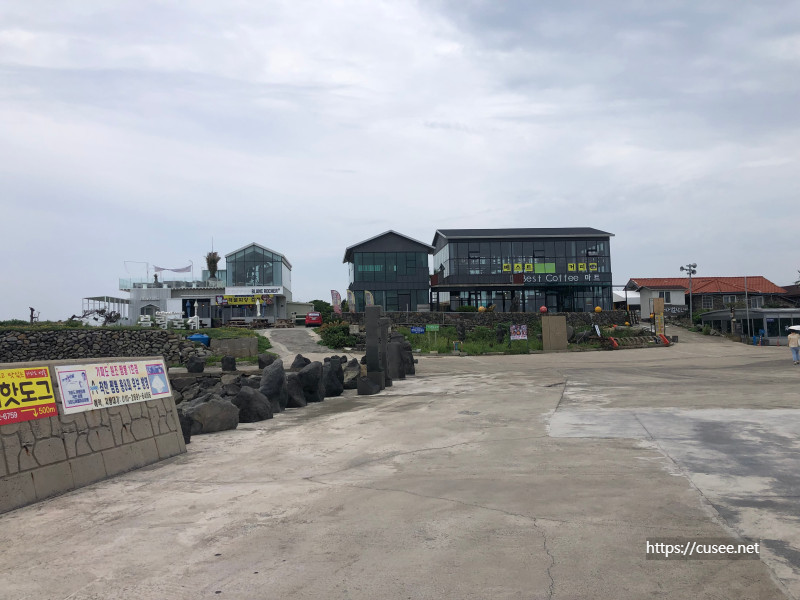 상동포구에 내리면 두 개의 풍경을 마주한다. 선착장에서 섬으로 보이는 풍경과 북쪽 바다 건너 송악산과 저 멀리 산방산이 보이고 모슬봉도 보인다. 찾아간 날은 장마 기간이어서 저 멀리 한라산은 구름 속에 숨었다. 포구 마당은 넓고 깔끔했다. 별도의 여객선 대합실 건물이 있고, 처음 마주하는 건물은 가게들이다.