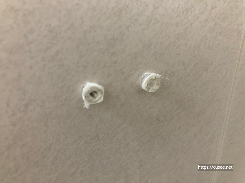 모서리 선반설치 작업 중 브라켓을 설치하기 위한 타공이 가장 어렵고 조심스러운 부분이다. 타공이 끝나면 붙였던 테이프를 제거해 준다. 깔끔하게 구멍이 나 있을 것이다. 타일이 아닌, 줄눈에 맞춰 타공을 하는 것도 방법인데, 그럴 경우 타일이 손상되는 것을 최소화할 수 있는 장점은 있다.