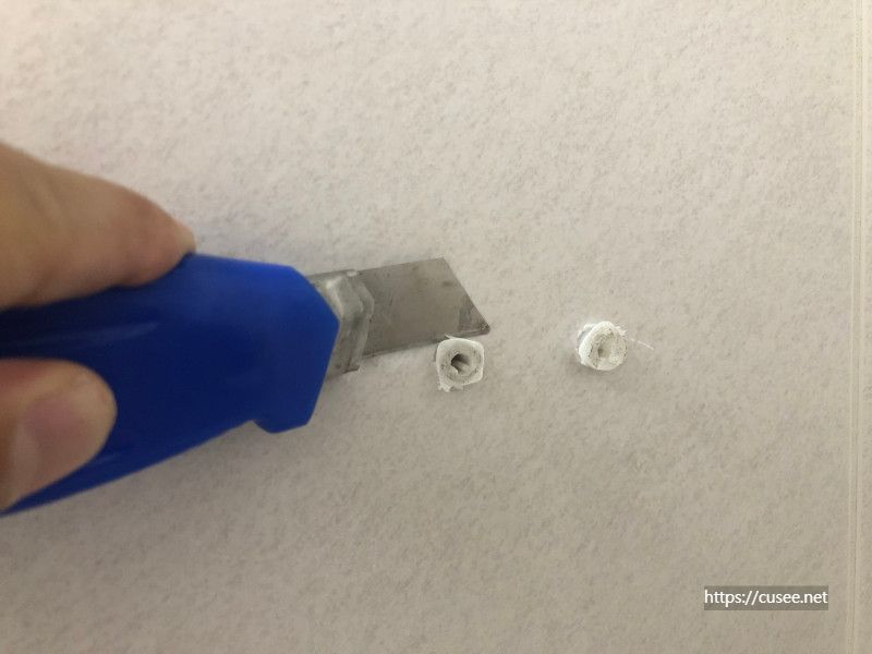 타공 구멍에 칼블럭을 넣고 망치로 두드려 칼블럭을 최대한 안으로 넣어준다. 나사 피스가 들어가서 팽창하는 구조이기 때문에 좁아 보여도 상관없다. 망치로 두드려 최대한 타일 벽 안으로 넣어준다. 최대한 넣어도 더 안 들어가는 부분이 생기는데, 이때 끝부분은 칼로 잘라주면 된다.