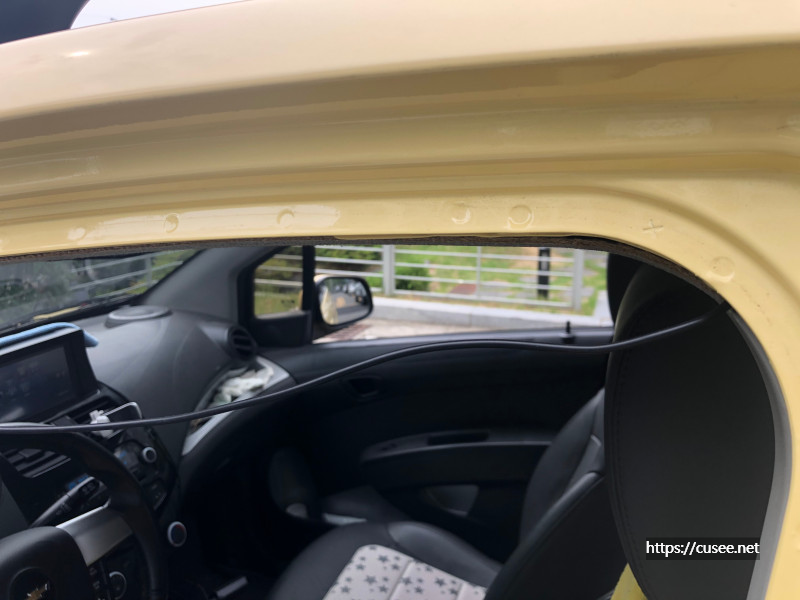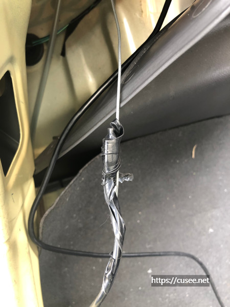 어떤 분은 이 철사를 스파크의 C-필러부분으로 바로 갈 수 있다고 하는데, 나는 아무리 해봐도 그게 안 되어 뒷 타이어 부분으로 케이블을 내려서 철사로 당겨 올렸다. 운전석 쪽에서 온 케이블은 B-필러 위 천정을 지나 C-필러 입구까지 왔지만, 위 사진의 끝 고무관으로 바로 통하지 않았다.