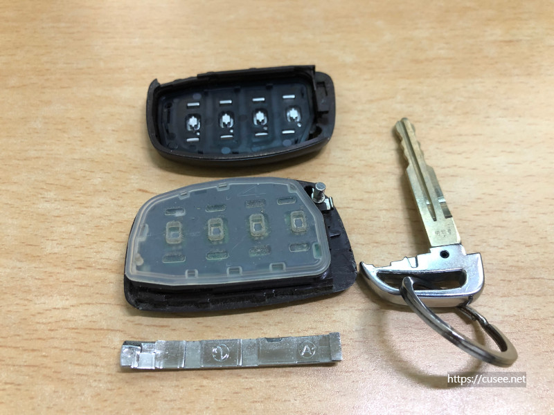 분리되면 위와 같이 상판 그리고 스마트키 회로기판 그리고, 결속 부위 디자인을 위한 플라스틱 조각으로 분리된다. 회로기판 위로는 고무 커버가 있어서 혹시 발생할지 모르는 수분 유입을 막는 방수 실리콘 커버가 있다. 혹시 스마트키를 물에 빠뜨렸을 경우 바로 사용하지 말고, 이렇게 분리해서 그늘에 말려서 다시 조립하면 계속해서 사용 가능하다.