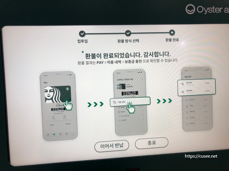 현금은 기계 중간의 오른쪽 현금방출구를 통해 나온다. 그리고 스타벅스 카드 충전금으로 받을 경우는 아래와 같은 안내를 따라 하면 충전된다. 회원 카드를 스캔(반납기 중간 바코드 스캐너)하면 충전된다.