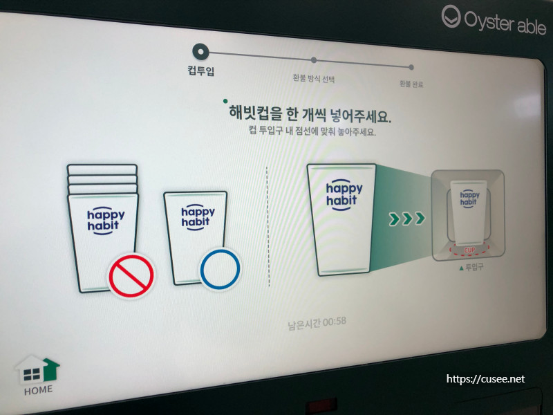 컵은 화면 아래 컵 투입구에 하나씩 넣어야 한다. 여러 잔이라고 쌓아서 넣으면 안 된다. 컵 반납은 단계마다 시간제한이 있다. 1분. 아래 카운트 다운이 계속되고 있으니 그 시간 안에만 요청하는 단계를 완료하면 된다. 카운트 다운은 별 의미 없다. 사용자가 컵 반납을 중단하면 다음 사람을 위한 것으로 추측된다.