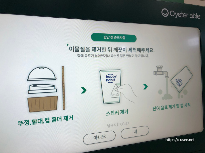 뚜껑과 빨대, 컵 홀더를 제거하고, 붙어 있는 스티커를 제거하라고 나온다. 스티커는 잘 떨어진다. 자욱이 남지 않으니 그대로 떼면 된다. 그러고 보니, 반납기 옆에 쓰레기통이 옆에 있는 이유가 이해가 된다. 잔여 음료는 제거하고 컵 세척하라고 되어 있는데, 화장실 옆에 있는 이유도 설명이 된다. 물론... 잔여 음료만 없다면 넣어도 어차피 세척을 거쳐 사용되기에 큰 문제는 없을 것이다.