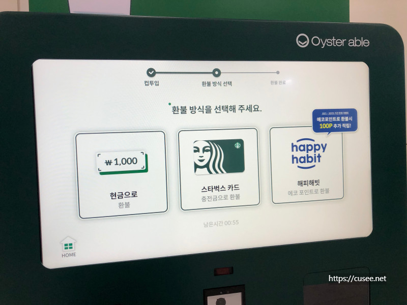 정상적으로 해빗컵으로 인식되었다면 환불 방식을 선택해야 한다. 방식은 3가지. 현금 1천 원으로 돌려받는 방법과 스타벅스 회원이라면 충전금으로 환불받는 방식, 그리고 해피해빗 에코 포인트로 환불받는 방법인데, 아마도 대부분은 현금 또는 스타벅스 카드 충전금으로 받을 거 같다. 난 현금으로 신청!