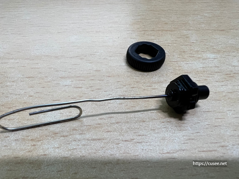 휠을 제거하면 다음과 같이 되어 있다. 휠의 축이 연결되는 부분은 휠을 통해 아래, 위 선택을 할 수 있는 기능이 구현되는 부분이며, 낮게 버튼처럼 되어 있는 부분은 클릭의 역할을 하는 누름 버튼이다.