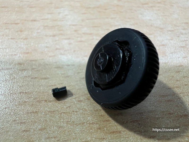 부러진 부분을 꺼내보면 원래 연결되어 있을 때를 상상해 볼 수 있다. 저 부위가 끊어지면서 휠의 동작을 전달하지 못하게 된 것이다. 휠 축은 기판의 결합 부위에 육각 모양으로 결속된다. 그래야 동작 전달을 통해 회전력이 전달된다.