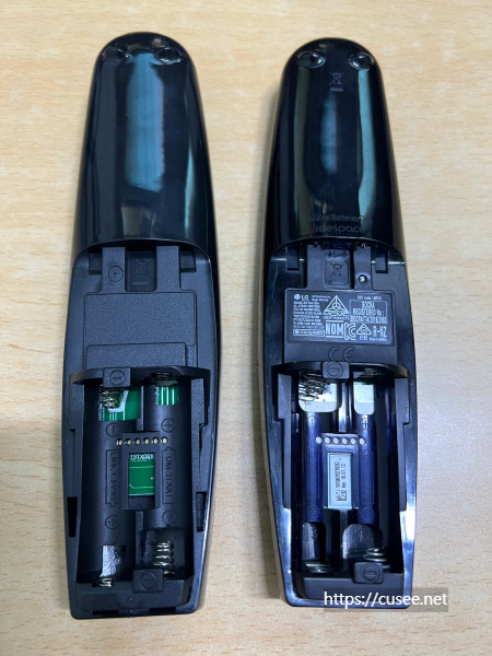 뒷부분의 배터리 장착 부분도 차이가 있는데, 알리에서 구입한 리모컨은 제품 정보가 없으며, 안쪽 기판도 정품과 색상이 다른 시금치 색상이다. 조금 더 저렴해 보이는 기판이다.
