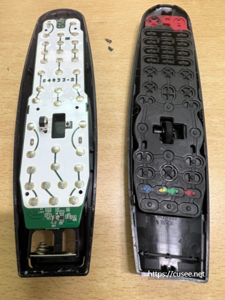 결국 호환품 휠 부붐을 장착한 정품 기판과 호환품 상하판, 고무 버튼 패드를 결합한 신종(?) 리모컨이 완성되었다. 남은 정품 상하판 커버와 호환품 기판, 그리고 고장 난 정품 휠만 남았다. 사실 이 리모컨도 쓸모는 있다. IR 기능이 살아 있어서, LG 모든 TV와 호환되며, OLED TV도 IR로 채널 변경, 메뉴 호출이 되고, 상하 좌우 이동도 가능하다. 다만, 클릭(확인)이 안 되는 치명적인 단점만 있을 뿐이다.
