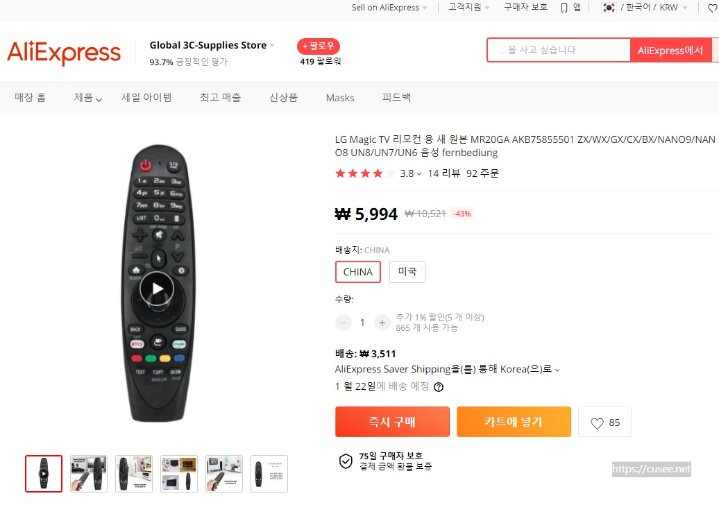 원화로 배송비 포함 1만 원 이하에 구입 가능했다. 다만, 배송은 12월 12일 주문 12월 31일에 일반 우편을 통해 받았다. 3주 만에 도착했다. 또한 이 제품은 마우스 포인트 기능과 음성인식 기능이 없는 단순 IR 리모컨이다.