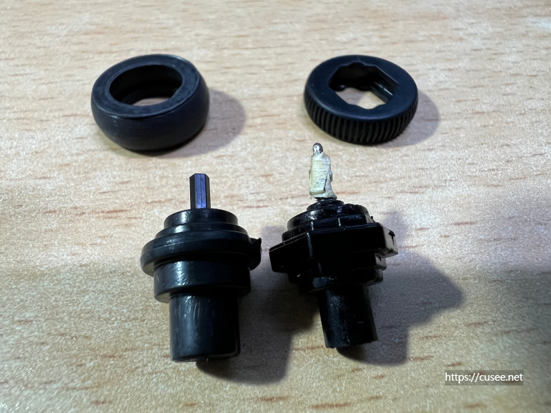 휠의 고무커버를 제거한 사진이다. 왼쪽 호환품과 오른쪽 LG 정품 휠의 차이다. 고무커버도 클릭이 전달되는 부위의 굵기도 다르다. 과연 제대로 동작을 할까 하는 걱정이 앞선다. 정품은 휠도 육각인데 반해 호환품은 원형이다. 다만, 기판 연결부위는 육각이다.