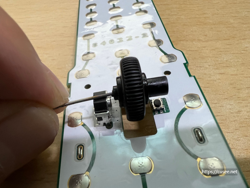 그러나 정상적인 상태라면 휠은 아래처럼 기판에 연결되어 있어야 하는데, 휠에 문제가 있었기 때문에 위와 같은 사진처럼 분리된 것이다. 휠이 기판과 연결되는 부분이 끊어졌다. 그래서 한쪽으로 기울었고, 휠의 회전이 인식이 안되었고, 클릭도 되지 않았다. 클릭은 휠의 다른 축 부분이 눌려지면서 그 아래 기판의 버튼을 누르게 되는 원리다.