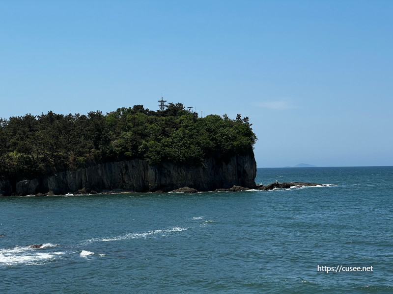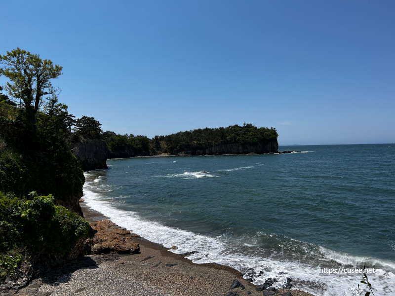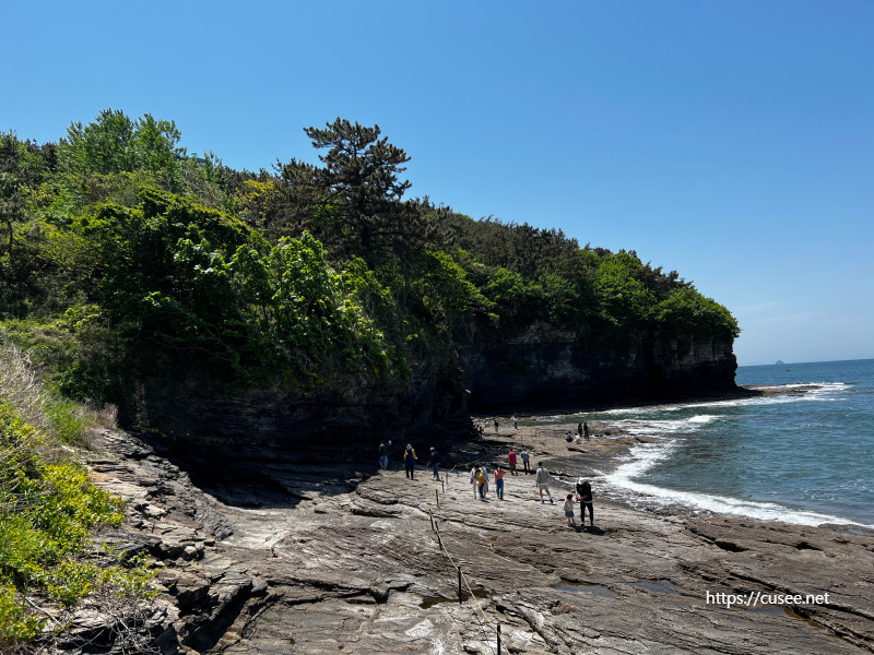 원래는 후박나무 군락이 있는 방향으로 가려 했으나, 공사 중으로 길을 막아놨다. 그래도 상관없는 것이, 적벽강 해안가로 내려가면 양쪽으로 해식절벽을 볼 수 있다. 하지만 역시나 물때가 밀물 시간대여서 가까이 가 볼 수는 없었다. 자료에 의하면, 이곳 적벽강은 화산활동으로 인한 주상절리가 있다고 한다.