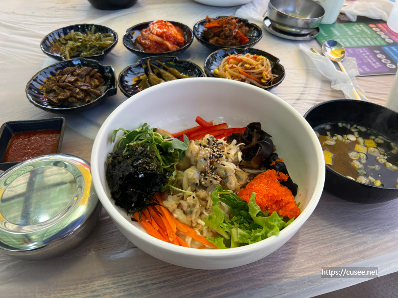 1시가 넘은 시간에 바지락 비빔밥 먹었다. 다들 똑같은 해산물에 칼국수집만 보여서, 가게 한 곳에 붙은 메뉴를 보고 먹으러 갔다. 맛 괜찮았다. 근데 관광지 물가라서 그런지 모두 비싸다.