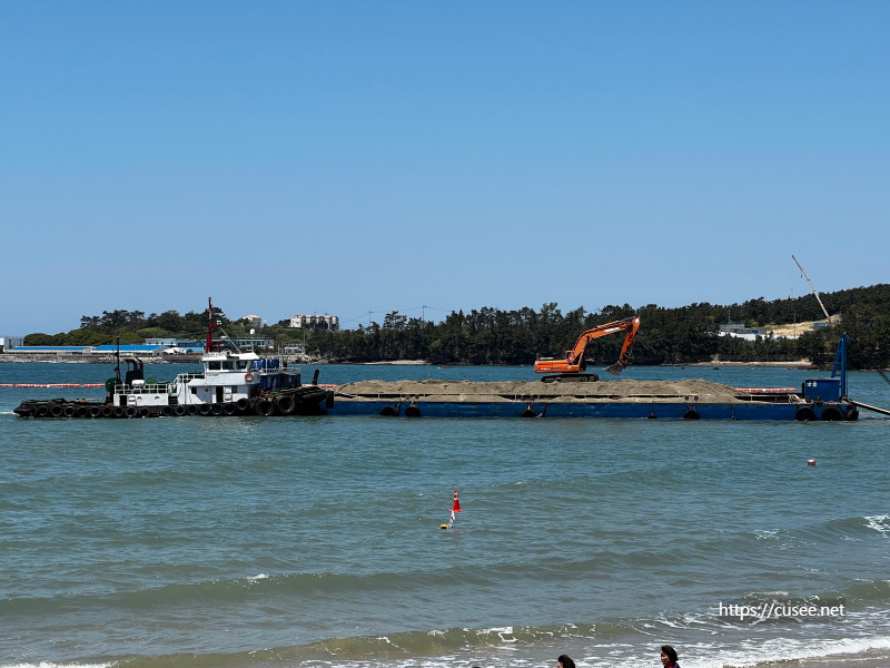 지금 격포해수욕장은 여름 개장 준비가 한창이다. 곧 다가올 여름 시즌 안전한 해수욕을 위해 바지선을 이용하여 모래를 해안에 뿌리고 있는 작업을 하고 있다. 사진 뒤쪽에 보이는 곳이 적벽강이다.