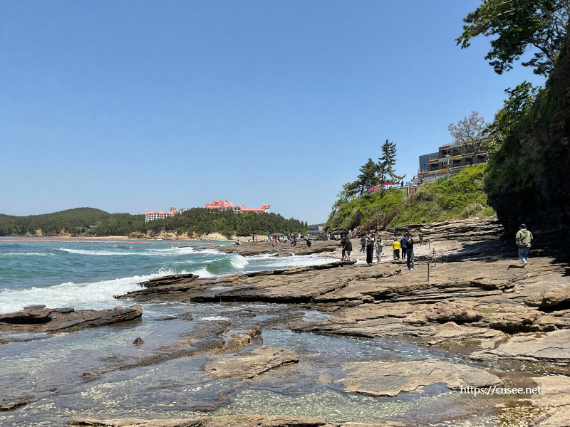 차가운 퇴적물과 뜨거운 유문암질 용암이 뒤섞여 만든 페퍼라이트, 유문암의 빠른 냉각에 의한 수축으로 형성된 주상절리와 퇴적암의 변형 구조를 관찰할 수 있다고 한다. 역시 해안가 지질탐사는 시간을 잘 맞춰 와야 한다는 것을 느끼며, 멀리서 사진 촬영하고 자료 읽는 것으로 대신했다.
