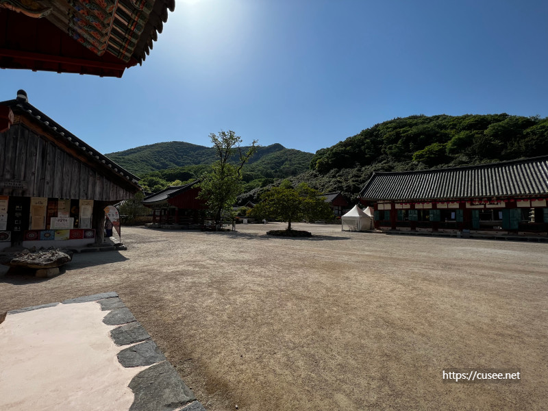 오른쪽으로는 푸르른 자태를 자신의 크기만큼이나 존재감으로 각인시키는 고송이 서 있다. 이런 날에 저런 나무는 반갑기만 하다. 그 아래 큰 그늘은 부처님의 자비처럼 시원하고 고마울 따름이다. 그 뒤로는 능인각, 동상실, 성보박물관 등이 있다.
