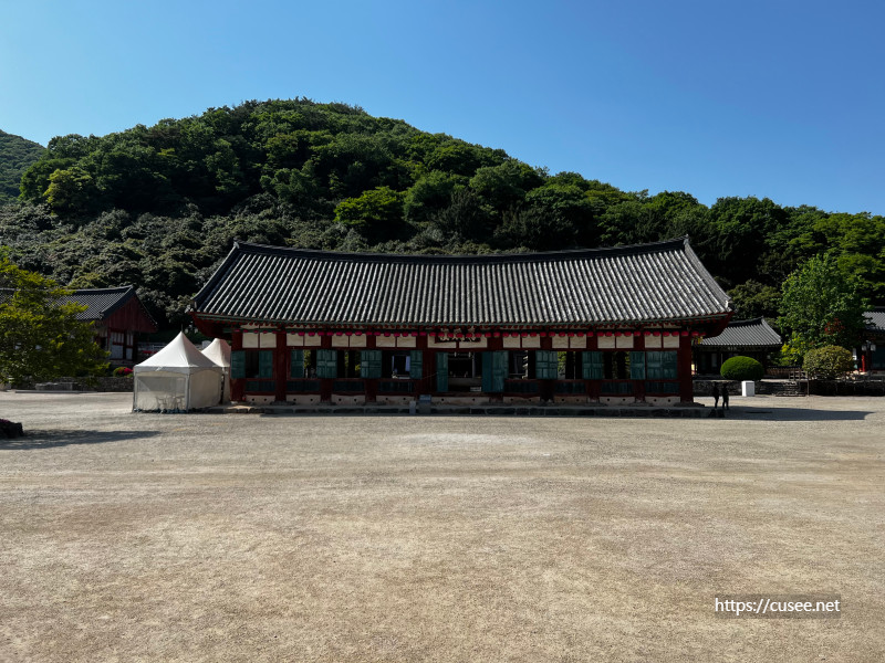 이 건물은 조선시대 만들어진 것으로, 대웅전 앞에서 예불과 설법 및 법회를 하는 공간이다. 일반적인 사찰에서는 그냥 마당에서 당(幢-불화를 그린 기)을 세워 진행했던 법단과 마당이 있던 자리인데, 조선시대에 들어서는 건축물을 지어 이런 공간을 대신했다고 한다. 덕분에 정면에서도 대웅전은 보이지 않는다.