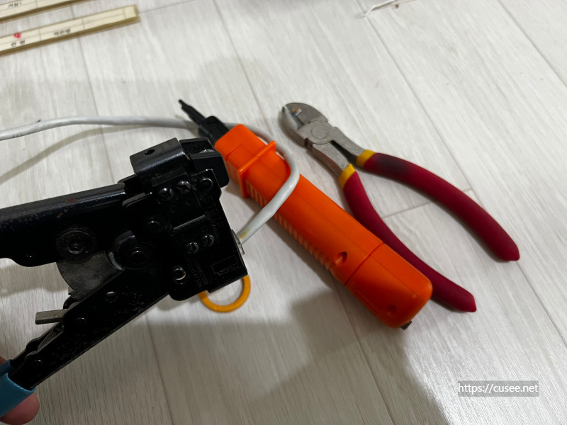 단자함에는 T5008을 넣는 것에 따라 새롭게 배선작업을 했다. 필요한 공구는 위와 같다. 랜케이블 만드는 랜툴(RJ45 8P8C용)이 없는 가정이 많을텐데, 저렴한 것은 1만원대에 판매되고 있으며, 110블럭에 선을 결착시키는 펀칭과 전선탈피 기능이 함께 있는 저렴한 제품도 있다. 검색해 보니 세트로 5,000원에 판매하는 곳도 있다.