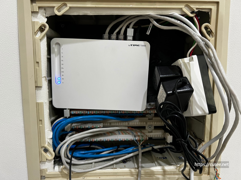 단자함의 파란색 케이블은 네트워크, 회색선은 전화선 용도지만, 지금은 유선전화를 사용하지 않아 두 회선 모두 인터넷 회선으로만 사용하고 있다. 각 포트마다 파란색, 회색선 CAT5.E (Giga 지원)이 연결되어 있다.