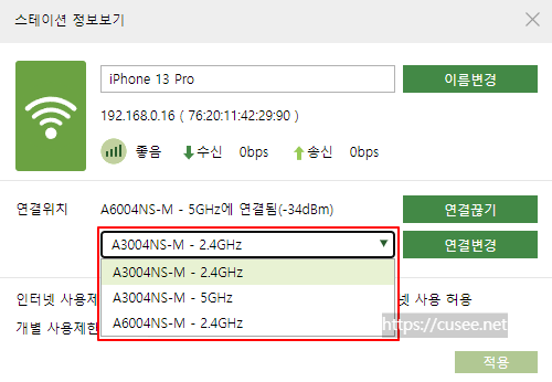 스테이션 단말기 상세화면인데, 기본적인 단말기 이름과 알기 쉽게 이름을 변경할 수 있으며, MAC주소, 송수신 상태와 신호세기 등도 함께 보여준다. 현재 단말기가 연결된 밴드(2.4GHz 또는 5GHz)를 보여준다.