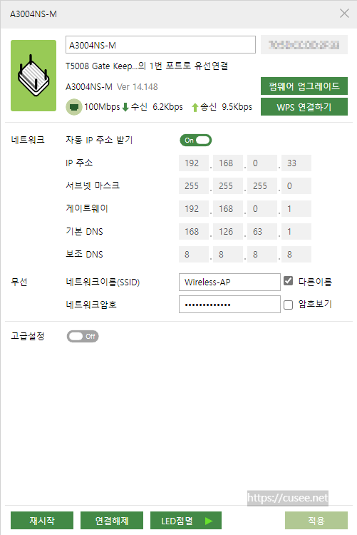 - 에이전트1 A3004NS-M : 192.168.1.1 대역 설정, Wi-Fi 듀얼밴드(2.4GHz/5GHz), SSID는 원하는 것으로 설정
