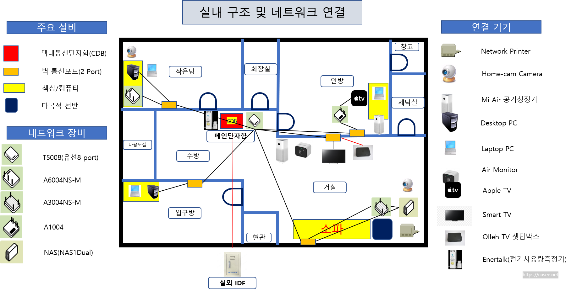 이지메시 환경 설정 전에 우리집의 구조와 네트워크 연결 방향을 결정한 그림이다. 현관 앞 계단에는 아파트 IDF가 있고 광선로로 우리집 세대통신단자함으로 연결된다. 지난달 말에 아파트 전체 공사를 했고, 모뎀도 CAT5.E 케이블 연결에서 광케이블 모뎀으로 바뀌었다.