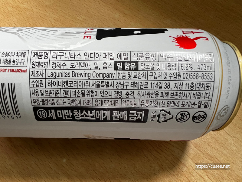 그러던 어느날 문득 편의점에서 만난 IPA가 있었으니, 바로 Lagunitas IPA다. '라구니타스'라고 읽는데, 맥주캔에는 친절하게도 'lah goo knee tuss'라고 말하라고 적혀있다. 발성대로 하자면 '라-구-니-투스'가 되겠지만, '라구니타스'라고 읽는 것이 정답.