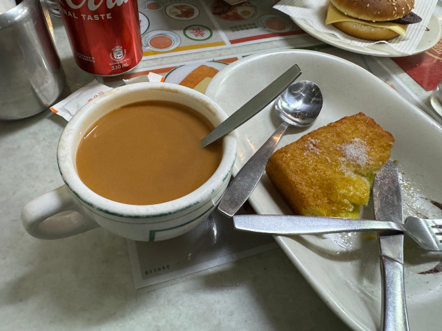 그래. 이왕 온 거 세트로 먹어보자 하고 먹었는데... 생각과 달리 느끼하고 기름이 줄줄... 딸이 주문한 토스트는 먹지도 않고 싸서 테이크 어웨이(Take away)했다.(포장 1개에 HKD1) 너무 느끼하단다. 호텔에 와서 식은 토스트를 맛봤을 때는 추천하지 않는다고... 토스트는 따뜻할 때 먹어야 한다.