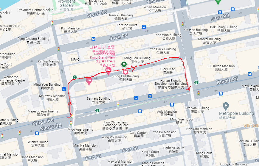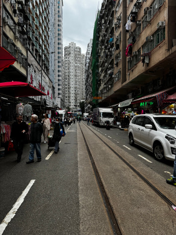 춘영거리시장은 시장 자체보다 트램이 시장 중간으로 들어오는 진풍경으로 유명한 곳이다. 이곳 현지인들에게는 시장이지만, 여행객에게는 흥미로운 장소다. 시장 거리 양쪽에 트램 정거장이 있는데, 오른쪽 끝(화살표 끝)이 North Point 종점역이다. 코즈웨이베이에서 North Point Tram Terminus 정거장으로 가면 종점이 여기다.