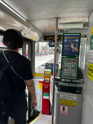 트램은 아무 거나 타도되지만 하나만 주의하면 된다. 센트럴 쪽으로 가려면 종착지방향이 Happy Valley(경마장) 방향만 아니면 된다. 물론 중간에 내려 갈아타도 되지만, 완차이쯤에서 남쪽의 해피밸리 방향으로 가는 트램도 있으니 주의. 트램은 모두 알다시피 버스와 달리 뒤로 타서 앞으로 내리는데, 내릴 때 요금결제한다. 옥토퍼스/비자/마스터카 필수. 현금내면 잔돈 못 받는다는 사실 알고 결제해야 한다. HKD3(아동은 1.5, 노인은 1.3) 이므로 거리에 상관없이 내릴 때 한화 500원 결제 정도로 매우 저렴하다.