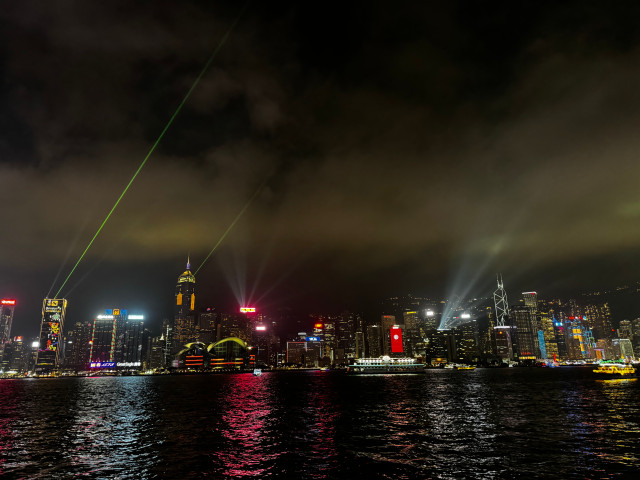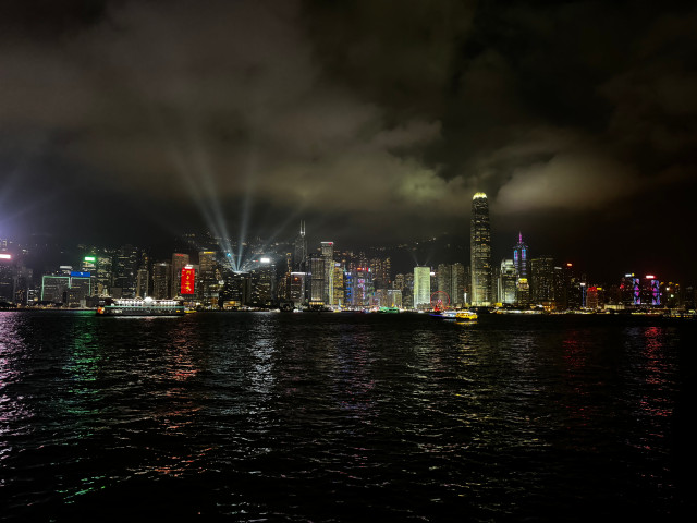 20시부터 약 10분간 음악과 함께 홍콩섬 그리고 침사추이의 대표적인 건물들이 레이저쇼를 한다. 침사추이 방향의 우리는 더 화려한 홍콩섬의 마천루들이 쏟아내는 불빛들의 춤을 감상하였다. 몇 번 봐서 그런지 예전 같은 놀라움은 없었지만, 매일 저렇게 때 되면 단체 안무를 하듯 약속된 쇼를 한다는 것은 지금도 놀라운 일이다. 오늘은 빌딩에서 쏘는 레이저가 구름 속으로 비치는 모습이 더 경이롭게 느껴진다.