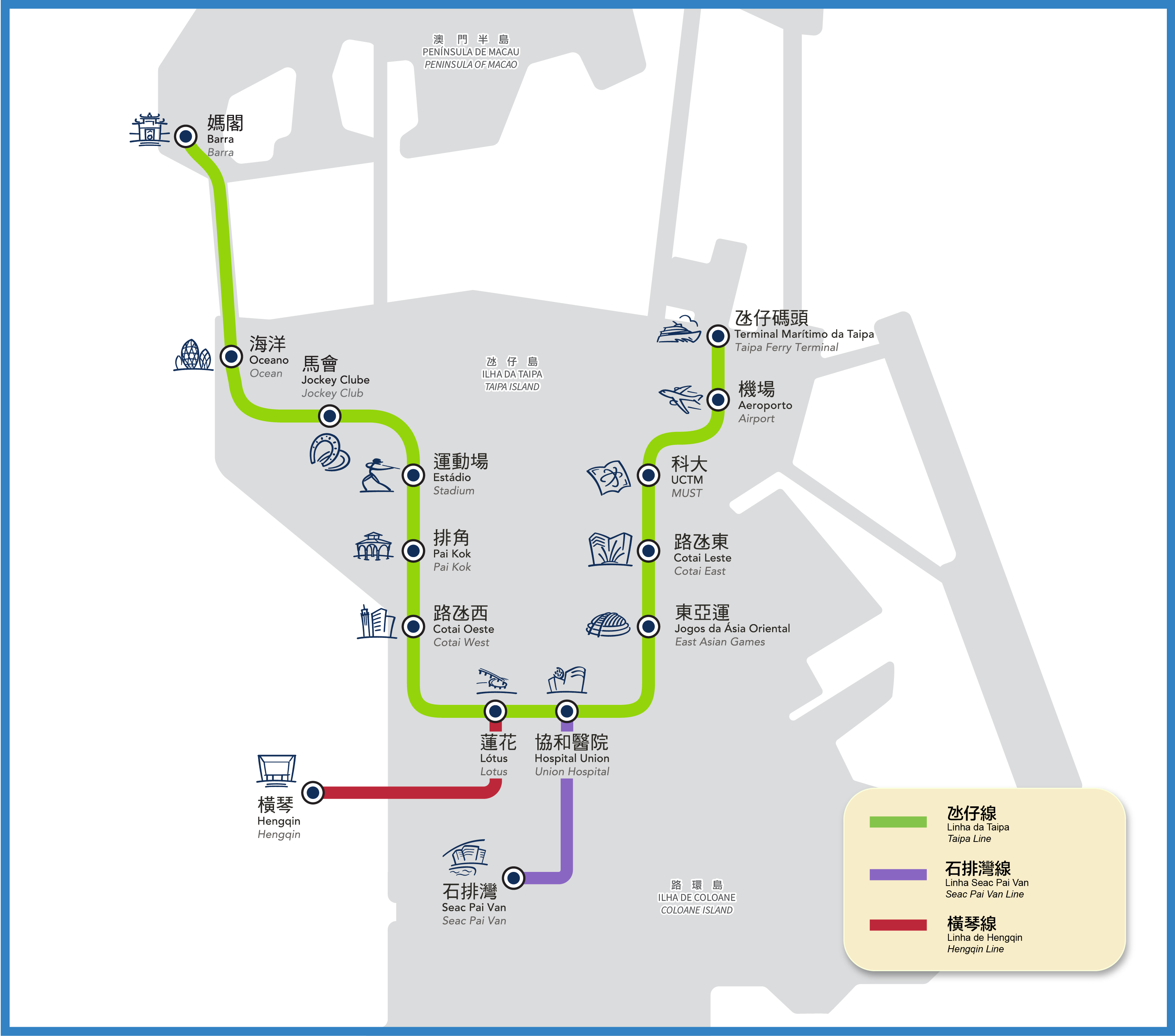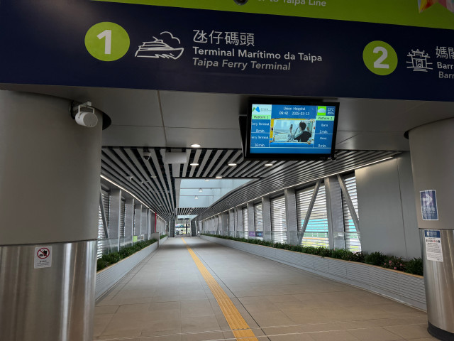 1번 승강장 방향은 타이파 페리터미널, 2번 승강장은 마카오반도 Barra로 가는 열차를 타는 방향이다. 마카오 LRT는 분당선처럼 무인으로 운행되며, 두 칸짜리 차량이다. 이 두 칸의 차량도 연결만 되어 있을 뿐 서로 통과는 되지 않은 독립적인 차량이다. 앞차와 뒷차가 있을 뿐이다.