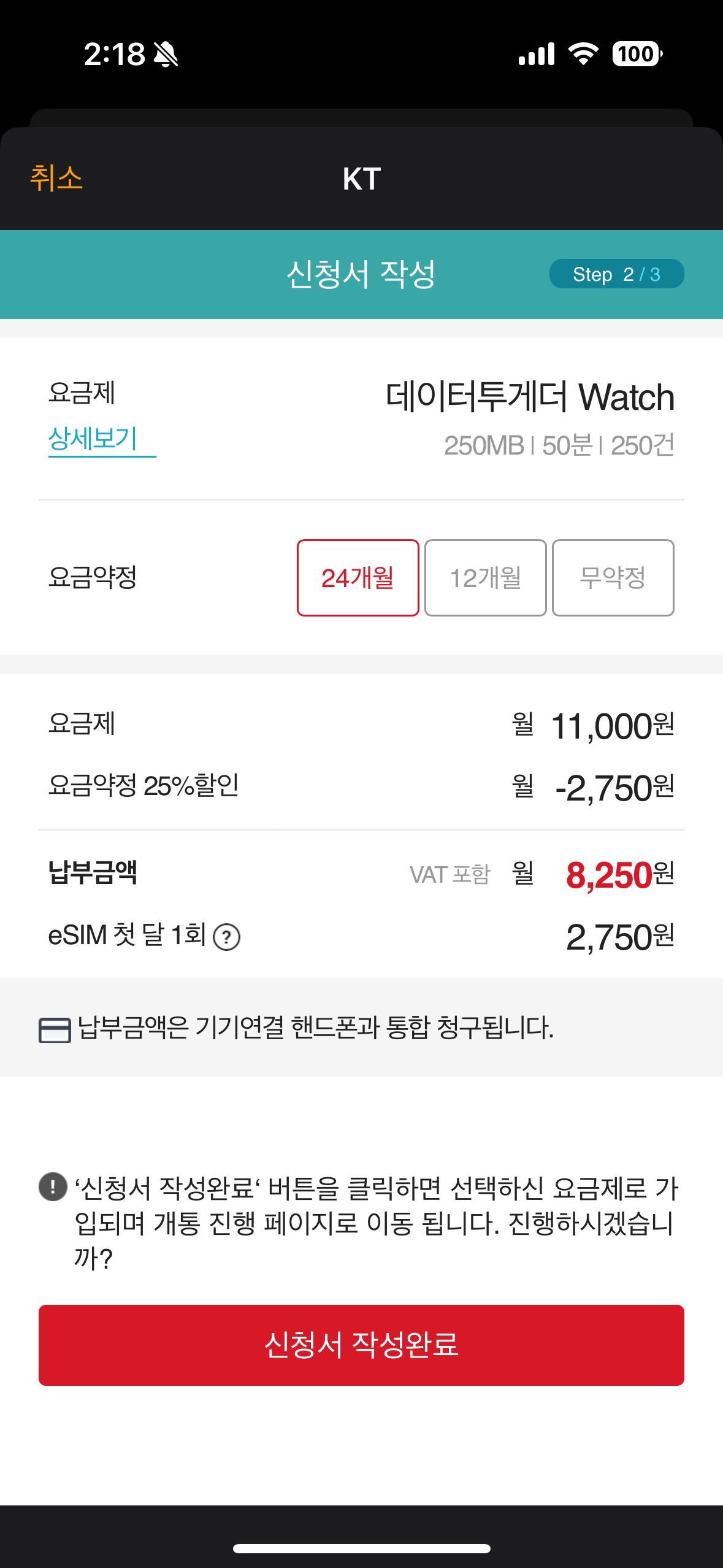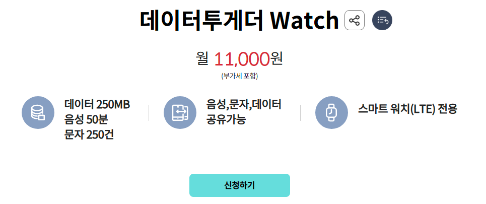 KT의 워치용 요금제는 '데이터투게더 Watch'라는 상품이다. 스마트워치 전용이며, 월 250MB, 음성 50분, 문자 250건의 요금제인데, 내 Apple Watch Ultra2를 개통해 보기로 하였다.
