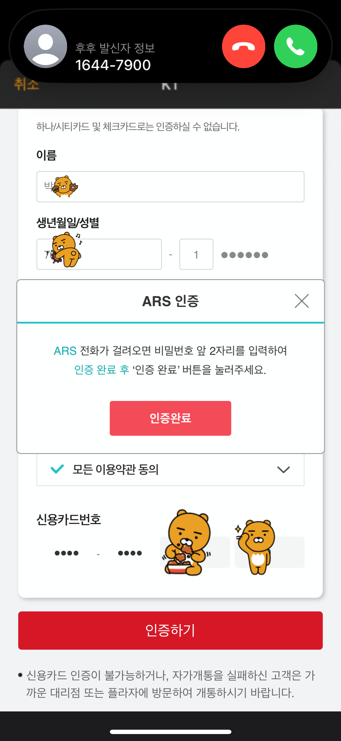 모든 정보 입력 후 ARS 전화를 통해 인증과정을 거친다.