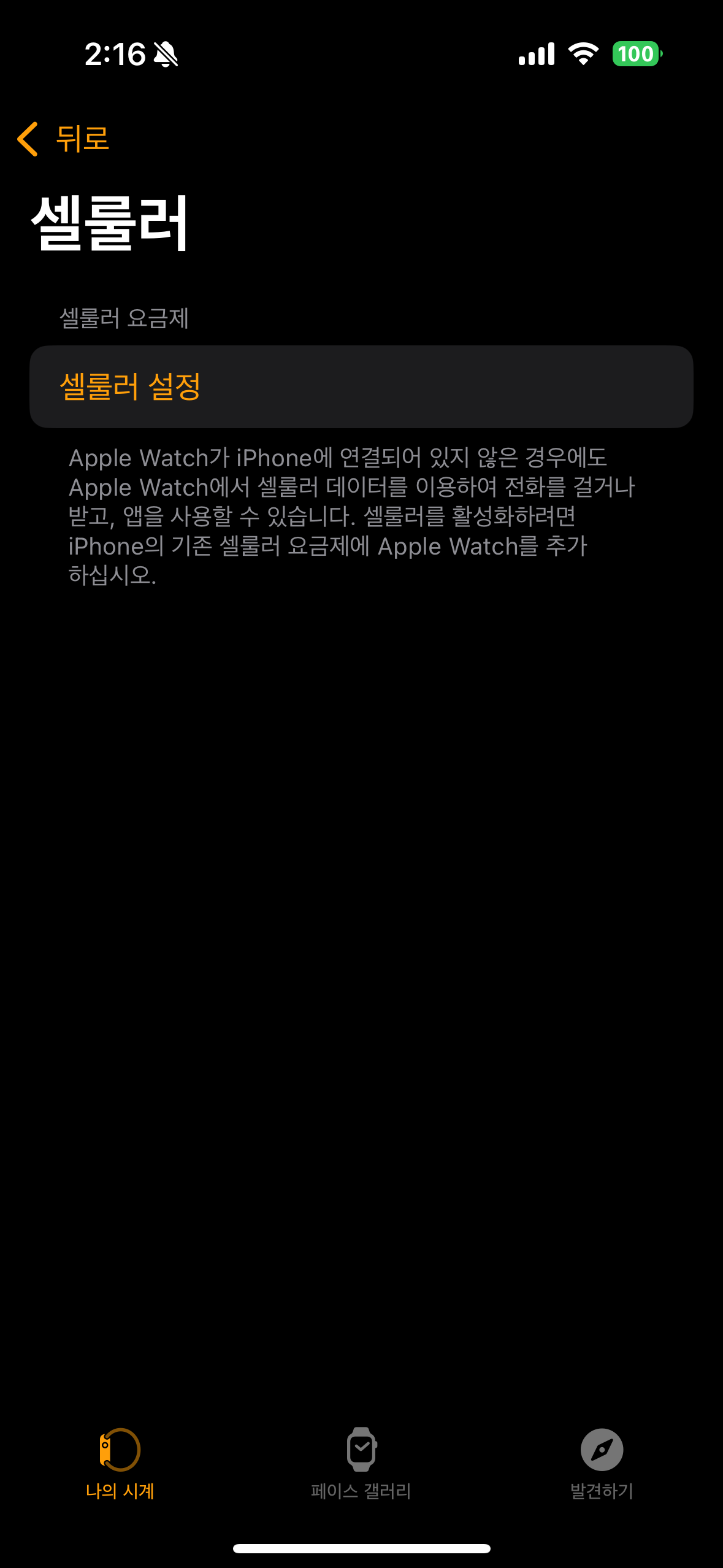 이로서 Watch 개통은 끝났다. 이젠 Watch에서 확인할 차례다. 설정에 기본적으로 셀룰러 사용으로 설정되어 있는지 확인하자, 셀룰러, 셀룰러 데이터, 통신사(선택불가), 상태 연결됨을 나타나면 정상이다.