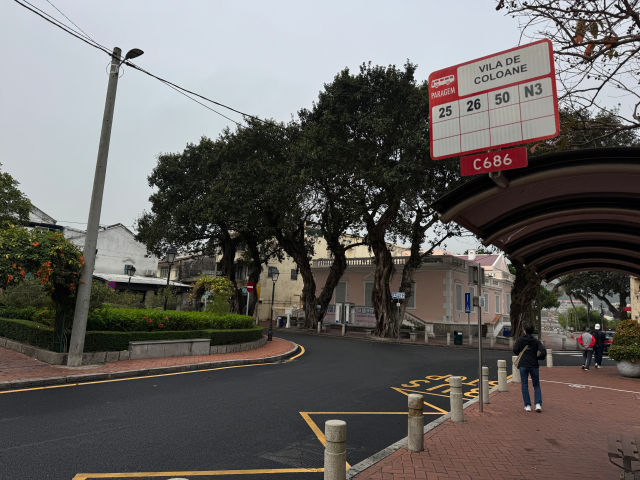 콜로안 빌리지(Vila De Coloane, C686)까지 가는 버스는 25, 26, N3이 지나간다. 이 시간대는 25번 아니면 26번이 지나가는데, 25번은 토요일 오전 10시 전까지는 8~10분 정도의 배차 간격이다. 10시부터 오후 3시까지는 10~15분, 오후 3시부터 8시까지는 6~9분 간격이며, 26번은 이 보다 배차 간격이 더 길다. 하지만 25과 함께 번갈아 다니므로 생각보다 금방 금방 콜로안 가는 버스가 온다고 느껴질 정도다.