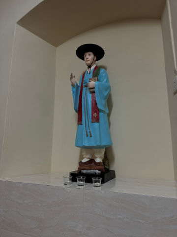 성당은 9시부터 문을 열기 때문에 바로 들어가 보지는 못했고, 잠시 동네를 둘러보고 9시가 넘어 성당에 들어가봤다. 본당도 작은데 그 옆에 더 작은 예배당이 있고, 그 안에는 놀랍게도 한복을 입은 도자기상이 하나 있는데, 바로 김대건 신부상이다.