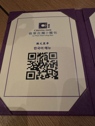 매번 호텔을 왔다갔다 하면서 1층에서 봤던 크리스탈 제이드에서 점심을 먹기로 하고 들어갔다. 혹시 한국어 메뉴가 있냐고 물어보니 이걸 내놓는다. 홈페이지가 있어서 바로 연결되는 QR이었다.
