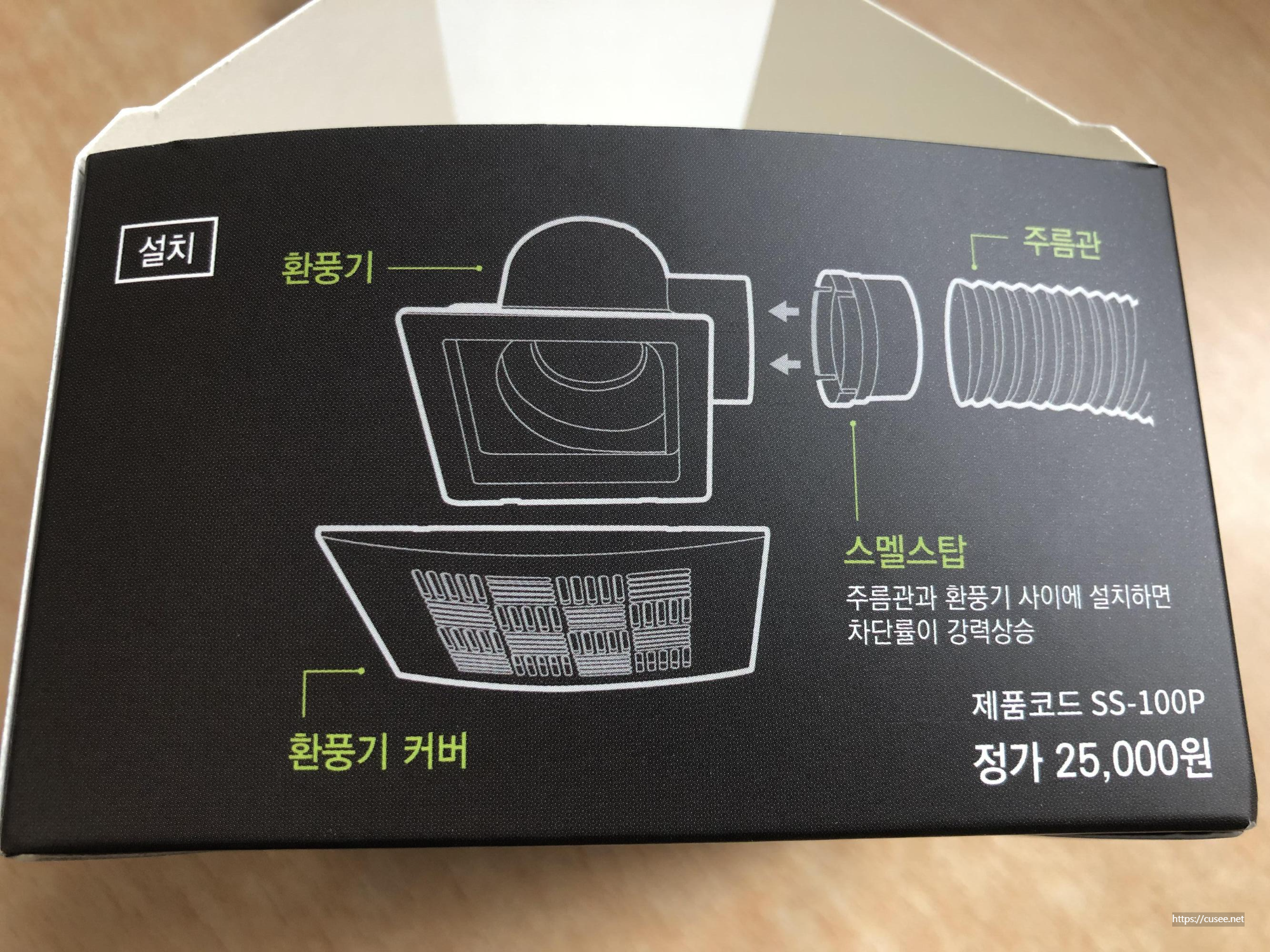 원통형으로 생긴 이 제품은 구경 100mm 관(표준)에 끼울 수 있도록 만들어져 있다. 중간에 필터 날개같은 구조물(노란색)이 있어서 한쪽으로 바람을 보내고, 반대로 들어오는 공기의 유입을 막도록 되어 있다. 약간 경사가 있도록 개발된 것이 이 제품의 특징이며, 특허기술이라고 밝히고 있다. 환풍기 구조에 따라 필터 날개가 잘 작동되게 하기 위해 경사를 둔 것 같다. 옆으로 세우게 되면 아무래도 경사가 있어야 날개 작동이 잘 될 것이니까. 아무튼 제대로만 작동하면 인정해 줄 테다.