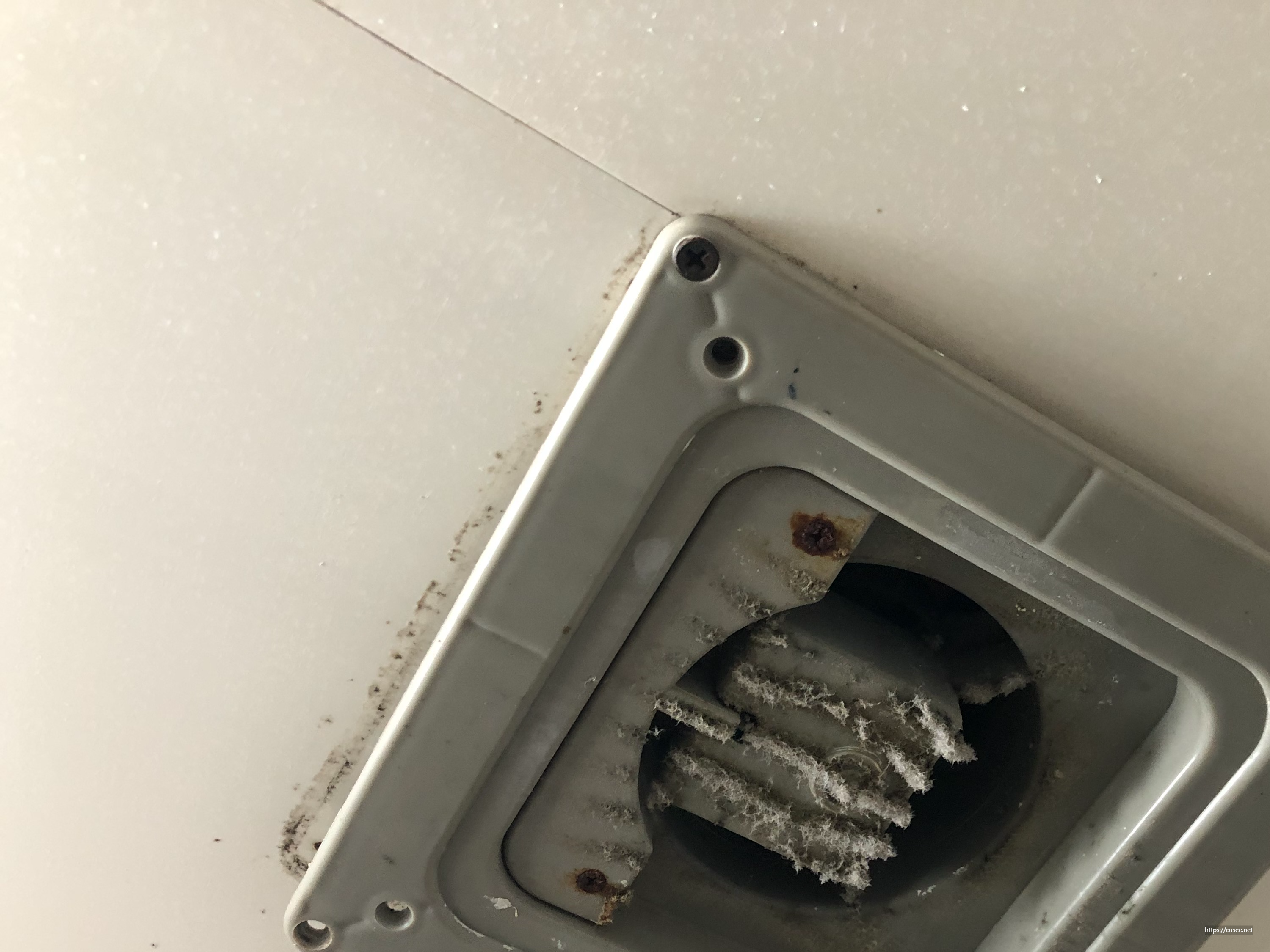 자... 이제 이 환풍기를 뜯어보자. 대부분의 제품은 환풍 날개를 보호하고 안전을 위해 커버(뚜껑)가 씌워져 있다. 사진의 경우 둥근 환기구멍과 빨래판처럼 필터망이 만들어져 있다. 이 부분에 먼지가 많이 붙어 있을 것이다. 대부분 화장실 내부에서 생긴 것보다 외부에서 들어온 먼지가 환풍기에 붙어 생긴 것들이다.