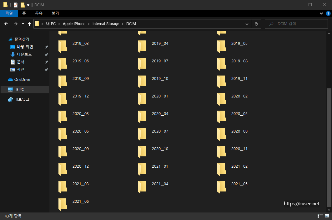 촬영된 이미지나 동영상을 iTunes가 아닌 윈도우 파일관리자에서 PC로 옮길 수 있는데, 촬영된 이미지 파일이 많을 경우 하나의 폴더에 썸네일을 보여주는 시간이 꽤나 부담스럽게 흘러간다. 이런 이유로 사진 파일이 많은 아이폰을 PC로 옮기기 위해 케이블로 연결하면 Internal Storage 디렉터리와 DCIM 디렉터리가 바로 보이지 않는 경우도 종종 발생한다.